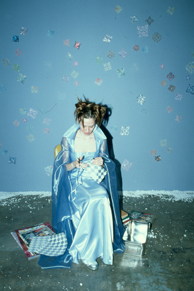 The Snow Flake Queen is a performance / installation project based on Hans Christian Andersen’s tale, “The Snow Queen,” wherein a devious Queen casts an evil spell on a village, which they may only be released from by spelling the word “eternity” out of ice. The installation is comprised of a collection of over a thousand one-of-a-kind hand-cut paper snowflakes made of colourful gift-wrapping paper, which are pinned to the wall. On one wall the word “eternity” is spelled out in a blizzard of flakes. The SFQ performance features me dressed in a costume fit for a “queen” where I offer to make snowflakes out of classic fairy tale book illustrations for the viewers as souvenirs of their “joyful” visit.